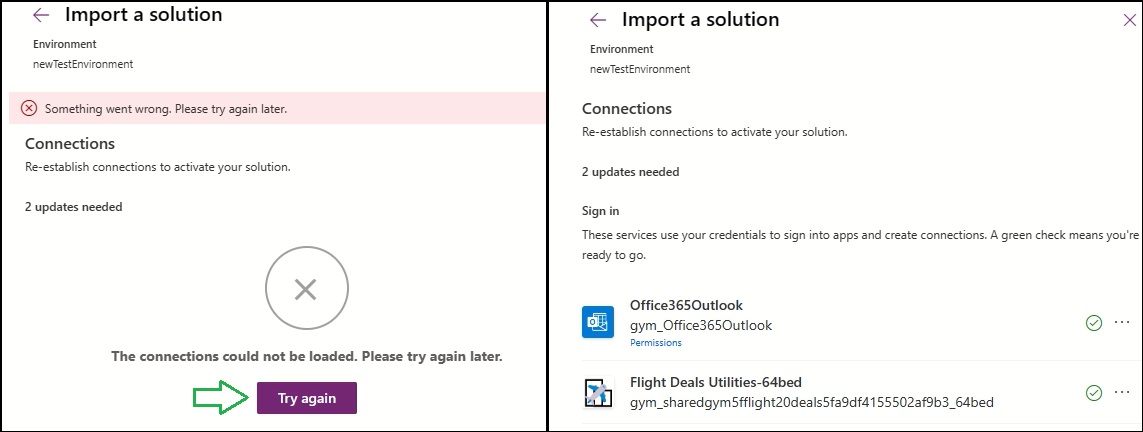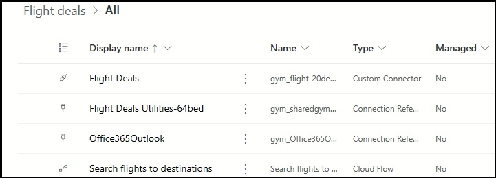 This solution is split in 2 different parts, which you can download from GitHub. If you are wondering why 2 parts this is because of a Custom Connector and connection limitation when having all resources in one solution: On import, when having Flows and other resources using the Custom Connector, you will be requested to create a connection, which is simply not possible if the Custom Connector does not exist in your environment yet. Hence, we import the Custom Connector first, after which we can map its connection to a Connection Reference. For this, you will import Part 1 [flightDeals_1_0_0_0 in repository above] of the solution as you would do with any other import: