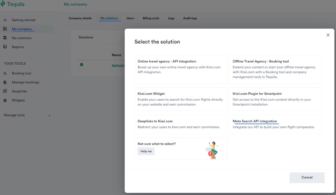 The registration should be relatively straightforward. Simply go to https://tequila.kiwi.com/portal/login/register. Once registered, log-in and go to My Company > My Solutions > Create Solution> Meta Search API integration > One way and Return. Enter the name and create the solution. This is what allows you integration with Kiwi's platform:
