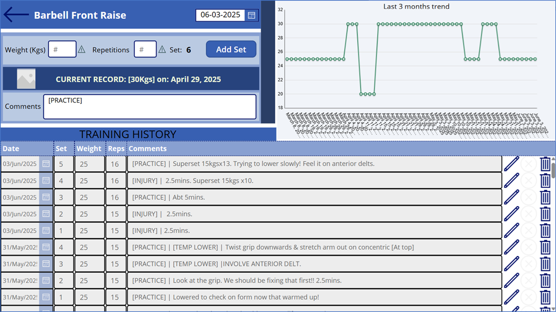 This screen allows you to record your exercise progress, edit and delete sets, review quarterly trends, check on exercise pics as well [As long as you have one for it] & the main reason I made this app: Having a "Comments" section that allows me to add my own observations for improvement.