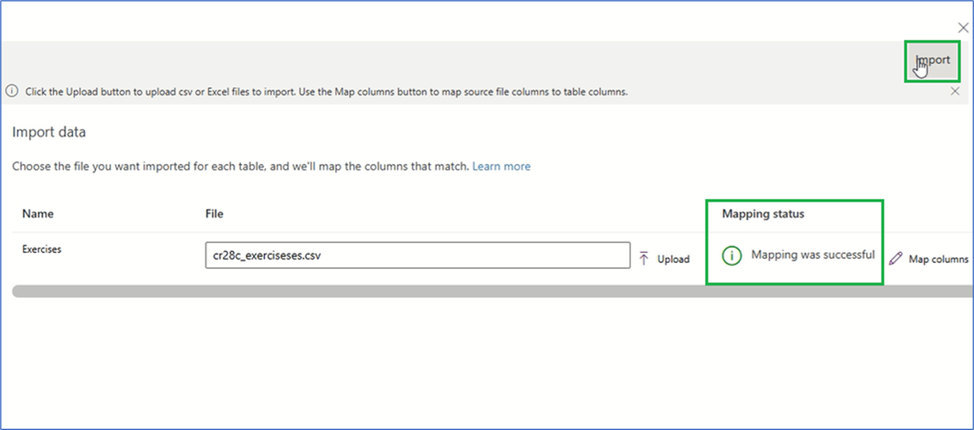 Once you upload the "cr28c_exerciseses.csv" data in the zip file and the mapping succeeds, make sure to click on import: